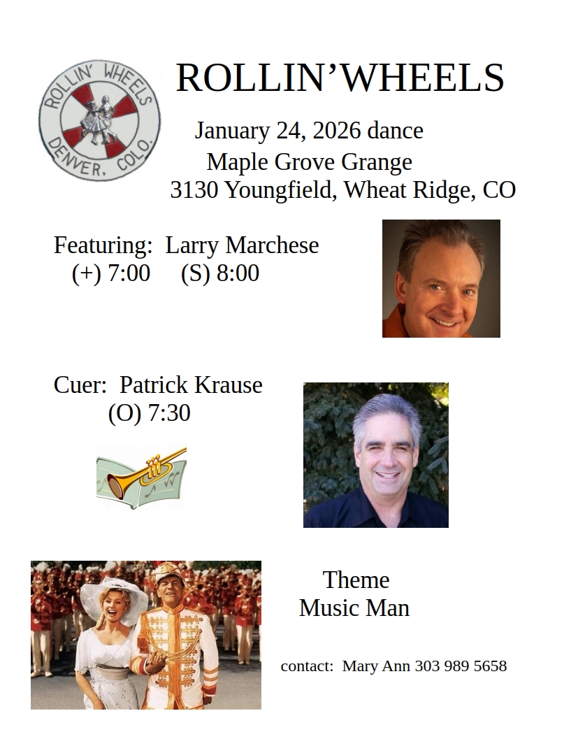 Saturday, January 24, 2026 7:00pm Caller: Larry Marchese Cuer: Patrick Krause Where: Maple Grove Grange 7:00 Plus, 7:30 Rounds, 8:00-9:30 SSD with Rounds $10 Theme: Music Man
